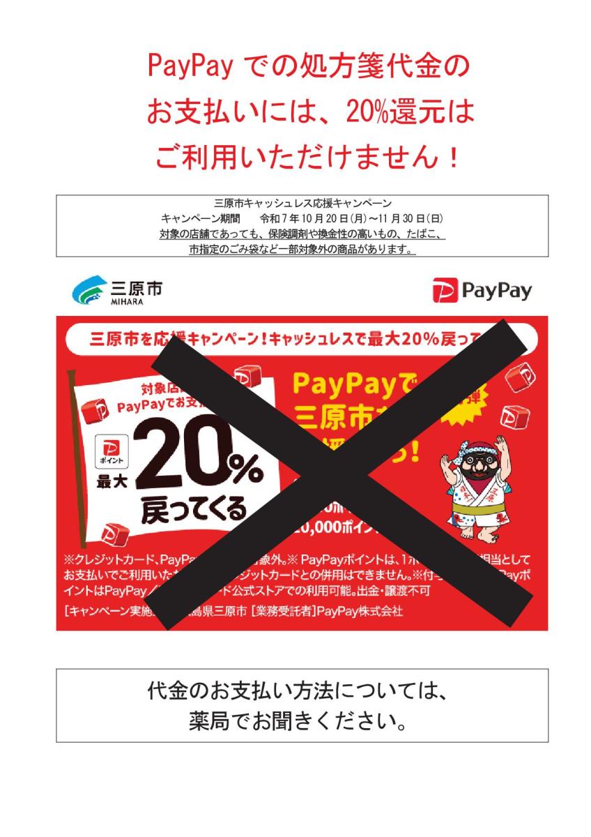 PayPayでの処方箋代金のお支払いには、20%還元は、ご利用いただけませんので、ご注意願います